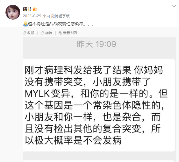 2023年6月,瞎书的女儿和她一样检测出携带MYLK异变,也是杂合。