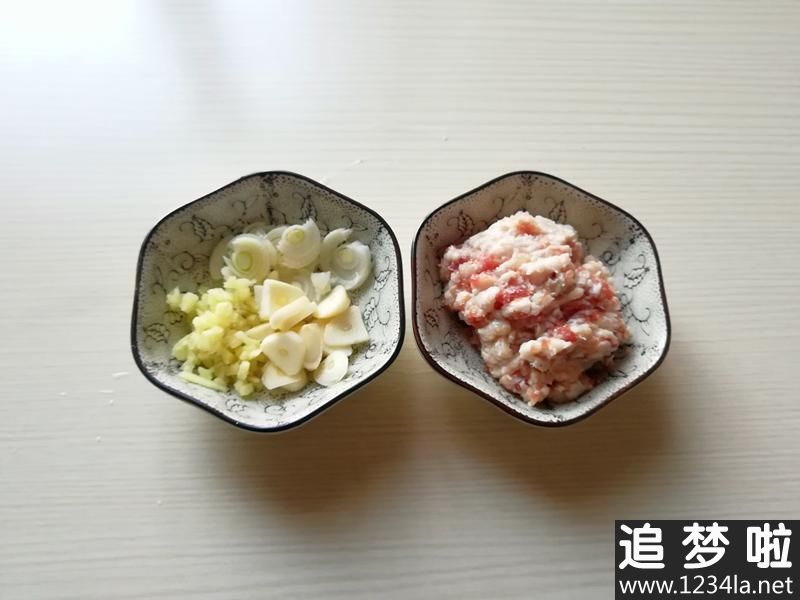 3.将猪肉切成末,葱切葱花,姜切末,大蒜切片